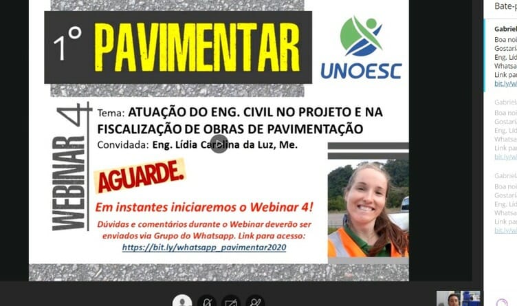 Conforme explica uma das organizadoras do Pavimentar Unoesc, professora Gabriela Ceccon Carlesso, o evento foi composto por uma série de cinco webinars, que são palestras online, ministradas semanalmente por profissionais atuantes nas diferentes esferas de projeto, execução e fiscalização de obras rodoviárias, bem como na realização de pesquisas científicas.
