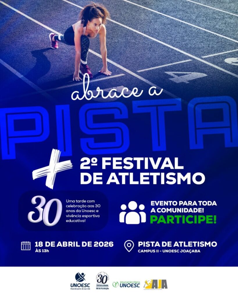A Unoesc Joaçaba, em parceria com a Associação Joaçabense de Atletismo (AJA), promoverá, neste sábado (18), dois eventos voltados à comunidade acadêmica e ao público em geral: o “Abrace a Pista” e o “2º Festival de Atletismo”. As atividades terão início às 13h, no Complexo Esportivo Professor Edmar de Oliveira Pinto, no campus 2, e integram a programação comemorativa pelos 30 anos de credenciamento junto ao Ministério da Educação (MEC) e pelos 58 anos da Fundação Universidade do Oeste de Santa Catarina (Funoesc).