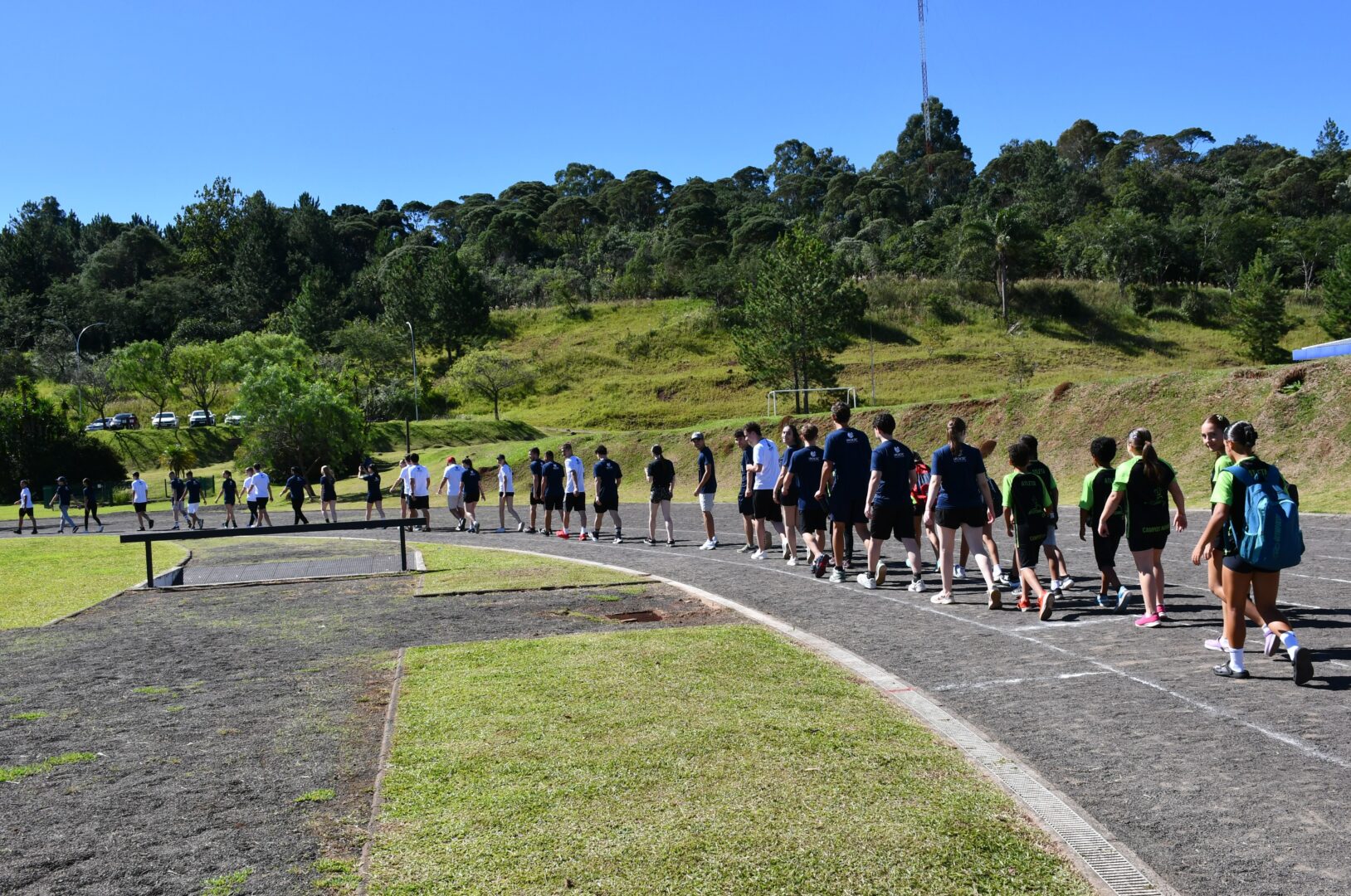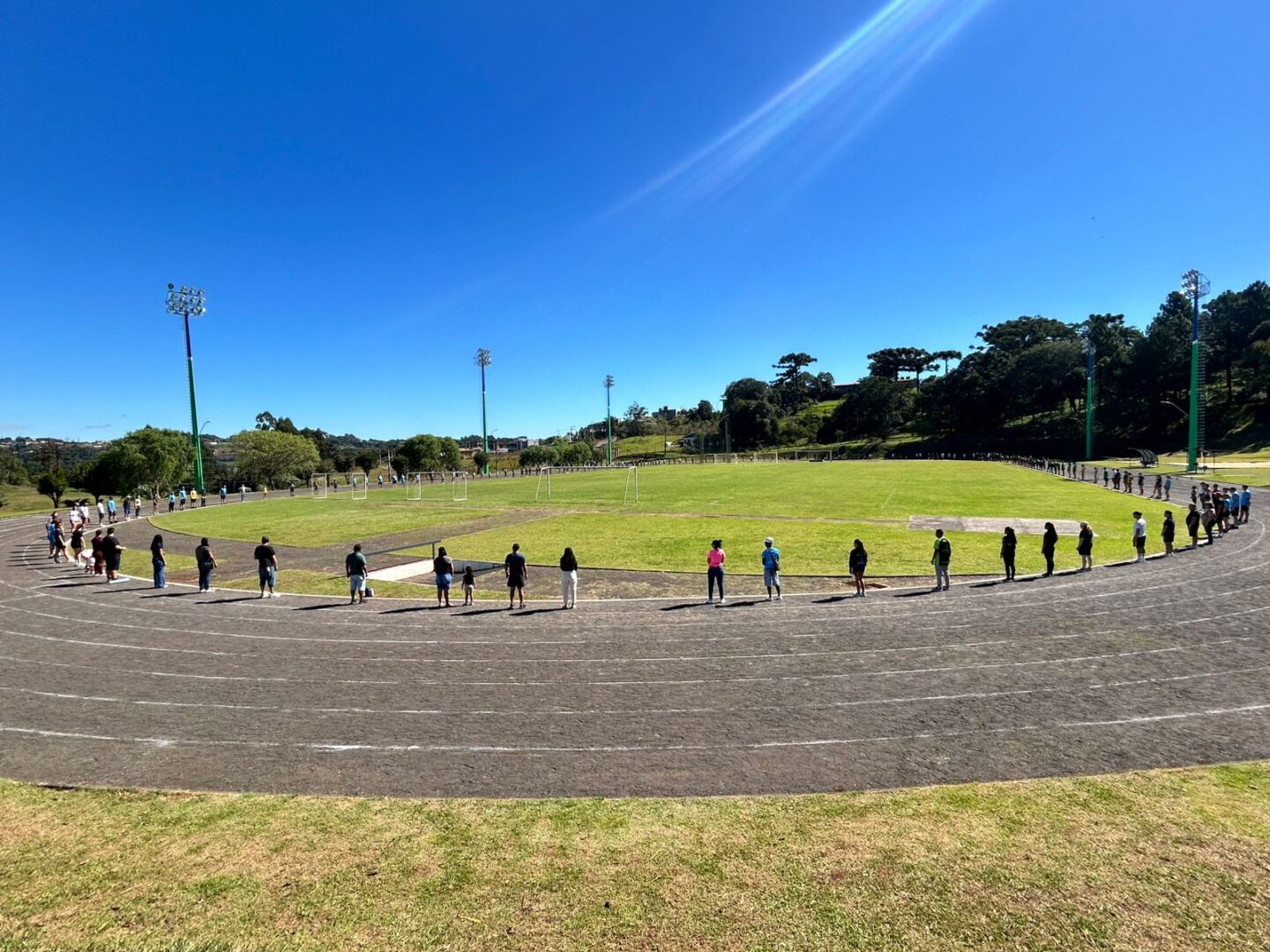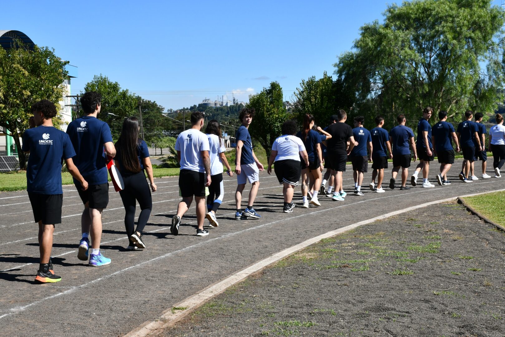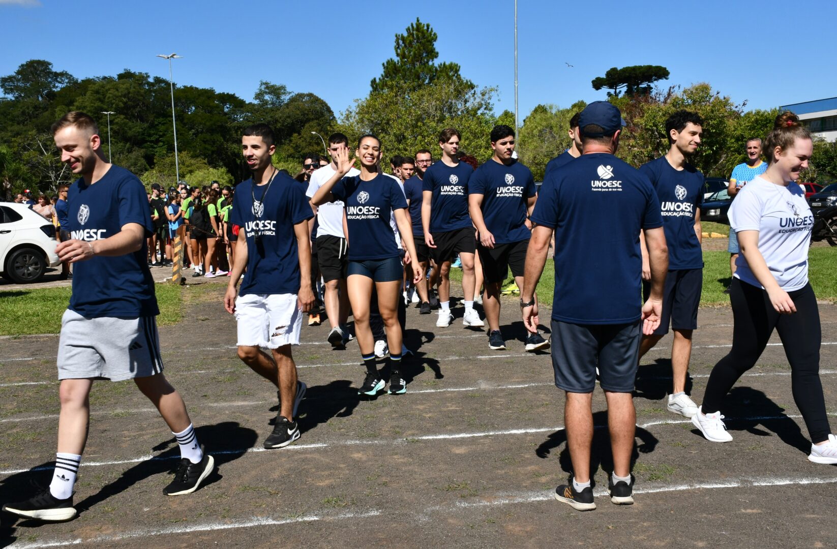A programação iniciou com o “Abrace a Pista”, quando os participantes abraçaram simbolicamente a pista de atletismo em uma homenagem alusiva aos 30 anos de credenciamento da Unoesc junto ao Ministério da Educação (MEC) e aos 58 anos da Fundação Universidade do Oeste de Santa Catarina (Funoesc).
