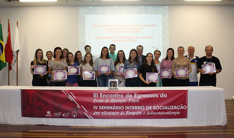 Na noite de segunda-feira,16, no Auditório do Campus 2 da Unoesc em Joaçaba, aconteceu a Cerimônia de certificação dos trabalhos apresentados no 10º Congresso da Rede Euroamericana de Motricidade Humana, realizado na Universidade Autônoma de Chihuahua (UACH), no México, entre os dias 13 e 15 de setembro. A solenidade foi realizada junto ao 3º Encontro de Egressos e do 4º Seminário Interno de Socialização das atividades de pesquisa e Internacionalização do Curso de Educação Física.