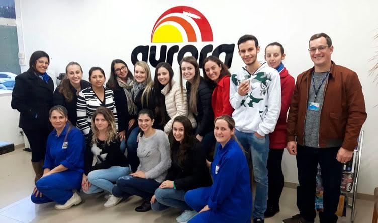 Na empresa, os acadêmicos foram atendidos por Cristiane Padilha, responsável pelo Centro de Memória da Fundação Aury Luiz Bodanese, vinculado à Cooperativa Central Aurora Alimentos. E a visita foi orientada por colaboradores responsáveis pelo setor de abate.