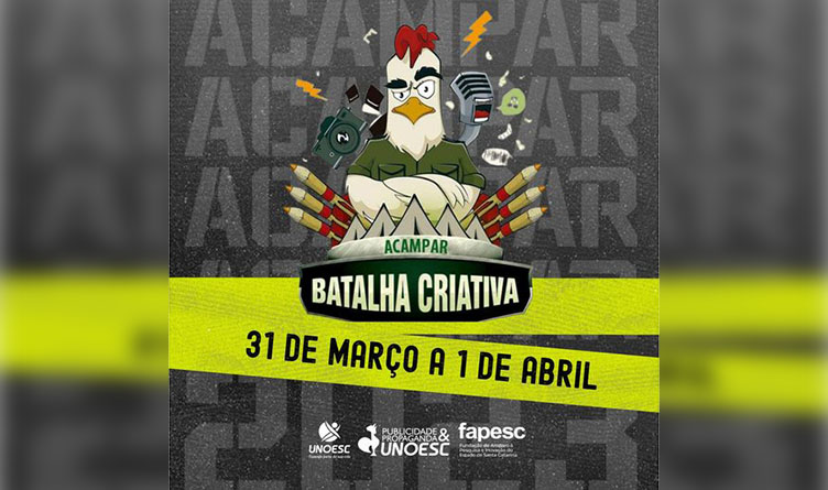 Está chegando a hora! Na sexta-feira (31/03) e no sábado (1º de abril), oito equipes formadas por estudantes do curso de Publicidade e Propaganda da Unoesc Joaçaba enfrentarão provas que envolvem trabalho conjunto, esperteza e conhecimentos específicos, no “Acampar -Batalha Criativa”, evento em formato de acampamento, que exige interação, criatividade e raciocínio rápido para completar tarefas semelhantes às do dia a dia dos profissionais de comunicação. A atividade acontecerá no Complexo Esportivo, localizado no campus 2 da Universidade.