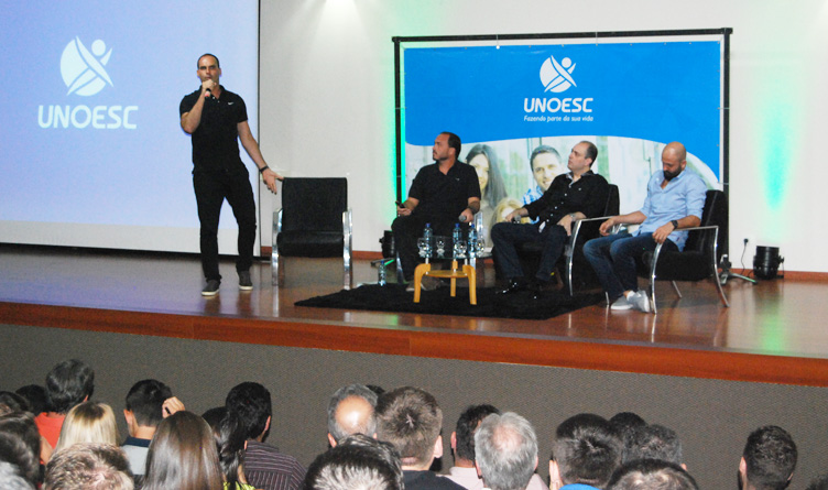 Em pé, sentado confortavelmente, apoiado na parede, agachado no corredor. Do jeito que dava, o público compareceu em peso no bate-papo sobre o desarmamento. O evento, que ocorreu na noite desta segunda-feira (13), reuniu cerca de 800 pessoas no auditório Afonso Dresch, da Unoesc Joaçaba, e foi transmitido ao vivo, pelo Facebook, atingindo 15 mil visualizações.