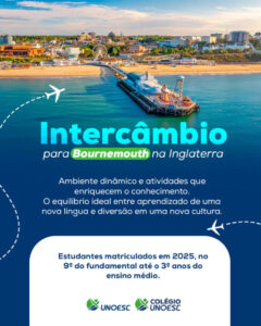 Os Colégios Unoesc possibilitam uma oportunidade de intercâmbio para Bournemouth, na Inglaterra. A iniciativa é voltada para estudantes matriculados em 2025, em todos os colégios mantidos pela Universidade, no 9º ano do Ensino Fundamental ou no 1º, 2º e 3º anos do Ensino Médio.