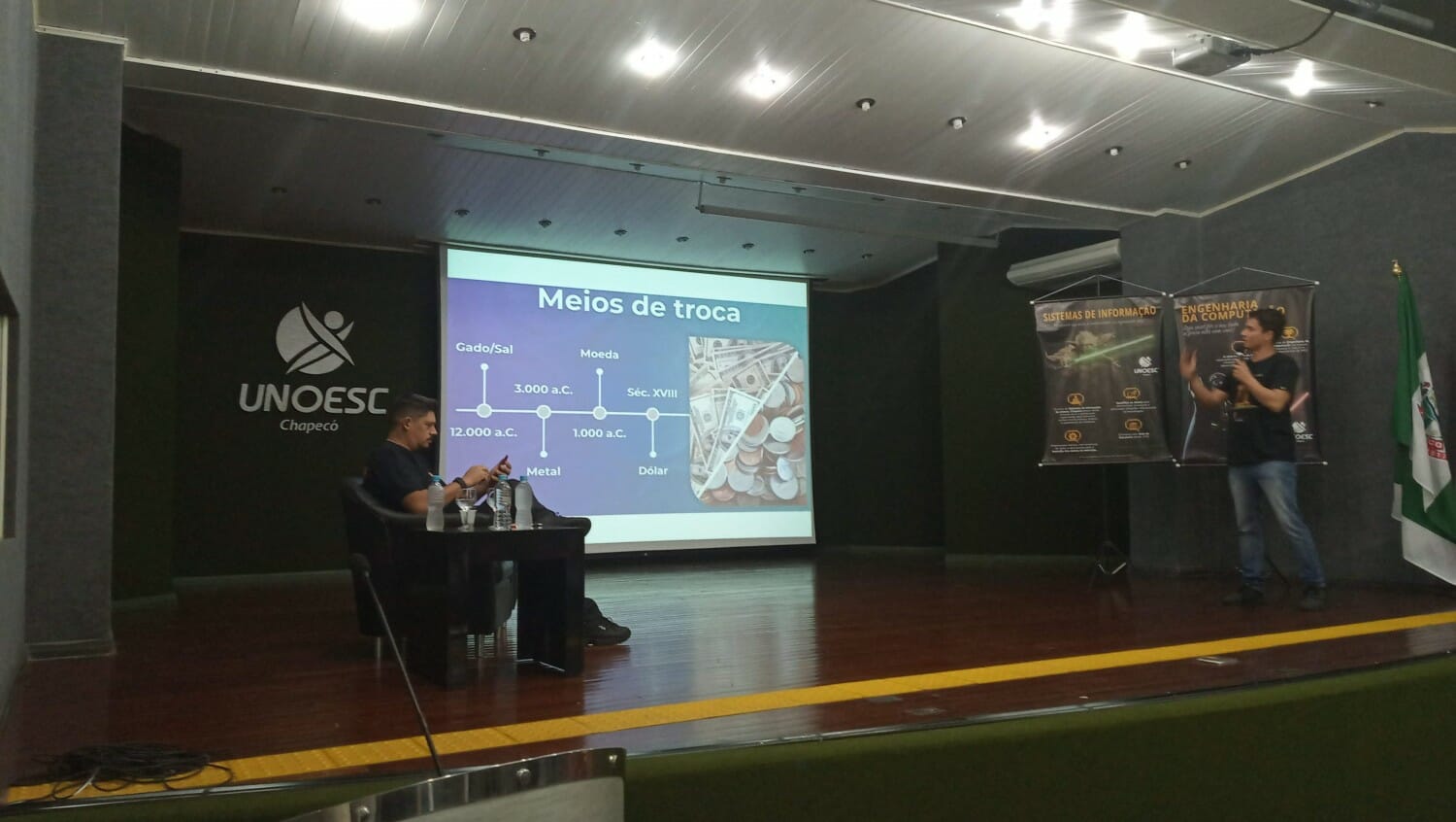 No dia 12 de Setembro, os cursos de Sistemas de Informação e Engenharia de Computação da Unoesc Chapecó, promoveram um Workshop sobre Criptomoedas com Rocelo Lopes da Stratum Blockchain Tech e Geizi Gava da Xbit/Finance Coins, ambos referências no assunto no Brasil e na América Latina.