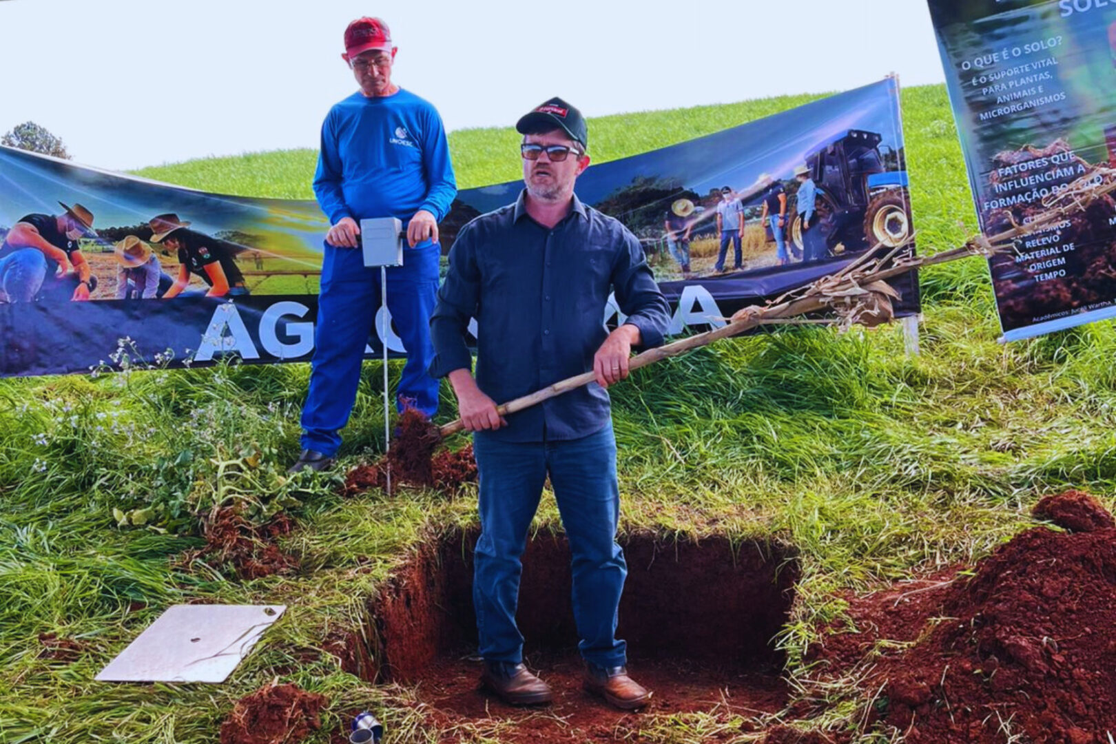 O professor André Sordi representou a Unoesc no evento e coordenou a estação sobre “Física do solo”. Durante a atividade, foram abordados os temas de agregação e compactação do solo, com demonstrações práticas a partir da abertura de uma trincheira e da utilização de equipamentos como anéis volumétricos e penetrômetro. O experimento possibilitou identificar níveis de resistência à penetração, revelando camadas compactadas e discutindo alternativas de manejo para inibir a compactação do solo.