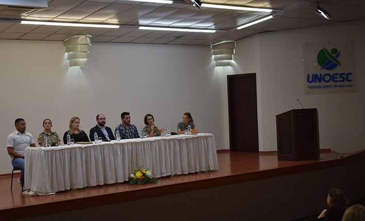 Fizeram parte da mesa redonda a Juíza da vara do Trabalho de Joaçaba, Lisiane Vieira, o enfermeiro da emergência do Hospital Universitário Dani Felipe, a promotora de Justiça Márcia Bittencourt, o delegado de polícia Eduardo Borges, a Tenente do 26º Batalhão da Polícia Militar, Gabriela Leal, e o enfermeiro da Atenção Básica de Campos Novos, Kléber Siqueira.