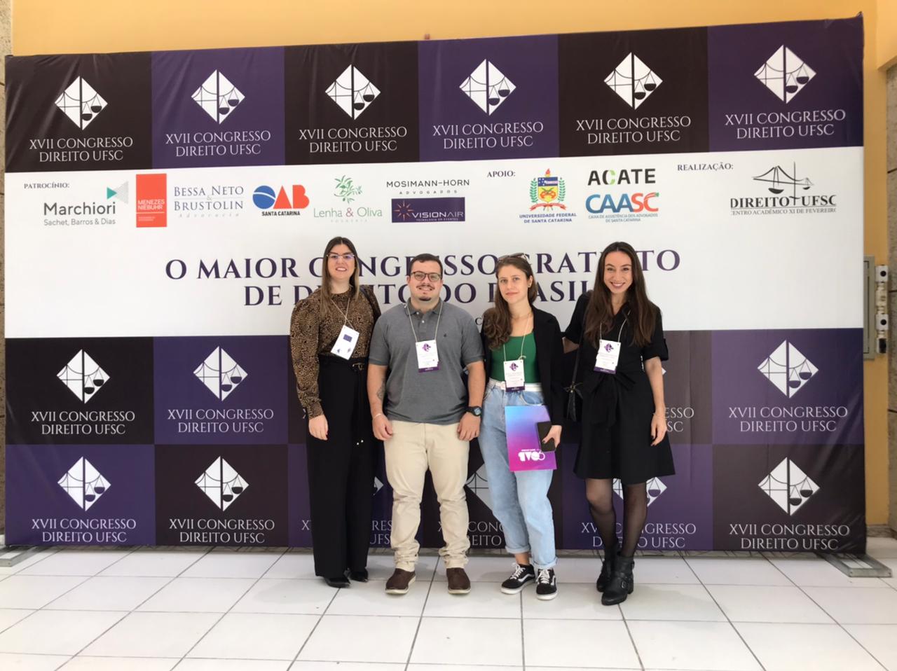 Estudantes e professores dos Cursos de Direito da Unoesc São Miguel do Oeste e Pinhalzinho participaram, nos dias 11 e 12 de maio, do XVII Congresso de Direito da Universidade Federal de Santa Catarina (UFSC), em Florianópolis. O evento teve por objetivo promover a produção acadêmica; integrar os Cursos de Direito do país com os rumos do pensamento jurídico nacional; criar um expoente do saber jurídico em Santa Catarina e buscar a evolução saudável da cultura jurídica, no Brasil, abordando temas controversos, que permitam a superação de paradigmas. O Congresso é considerado o maior evento jurídico gratuito do Brasil.