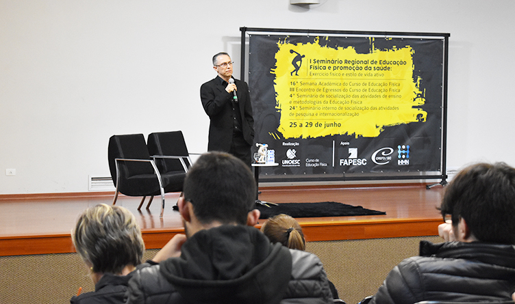A noite desta quarta-feira, 27 de junho, foi marcada por mais uma palestra do Seminário Regional de Educação Física e Promoção da Saúde. Neste dia, o curso recebeu o professor da Universidade de Passo Fundo (RS), Ben Hur Soares, para falar sobre o tema “Envelhecimento: atividade ou desengajamento?”. A palestra ocorreu no auditório Afonso Dresch da Unoesc Joaçaba e foi transmitida ao vivo pelo Facebook, alcançando, em média, 700 pessoas.