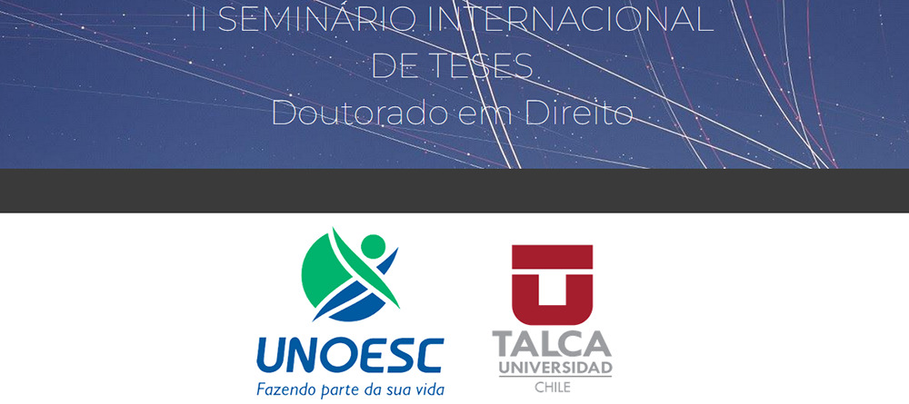 O Programa de Pós-graduação em Direito (PPGD) da Unoesc, que reúne os cursos de Mestrado e Doutorado, em parceria com o Programa de Doutorado em Direito da Universidade de Talca (UTalca), Chile, promoverá nos dias 22 e 23 de junho o “2º Seminário Internacional de Pesquisa de Teses”. O evento será realizado por teleconferência e transmitido pelo Canal do YouTube do PPGD Unoesc.