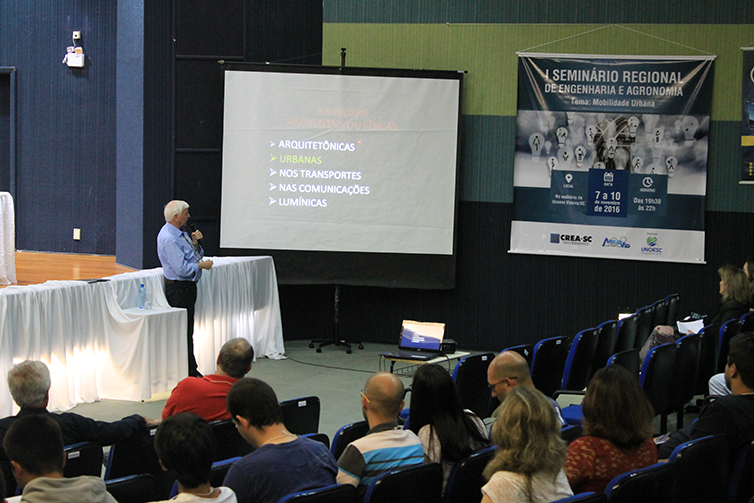 A palestra do primeiro dia foi ministrada pelo presidente do CREA-SC, Carlos Alberto Kita Xavier que abordou o tema Legislação, Ética e Valorização Profissional. Nas noites subsequentes, contou com temas como Acessibilidade, com o palestrante Décio Bevilacqua. No dia 9 de novembro, Planejamento Integrado, Mobilidade e Uso do Solo, com o palestrante Carlos José Antônio Kümmel Félix — Doutor em Mobilidade Urbana. Já no encerramento, na noite de ontem dia 10, o tema apresentado foi Sistemas de Trânsito, com o engenheiro civil e de segurança do trabalho, Rui Voldinei Pires especialista em trânsito.