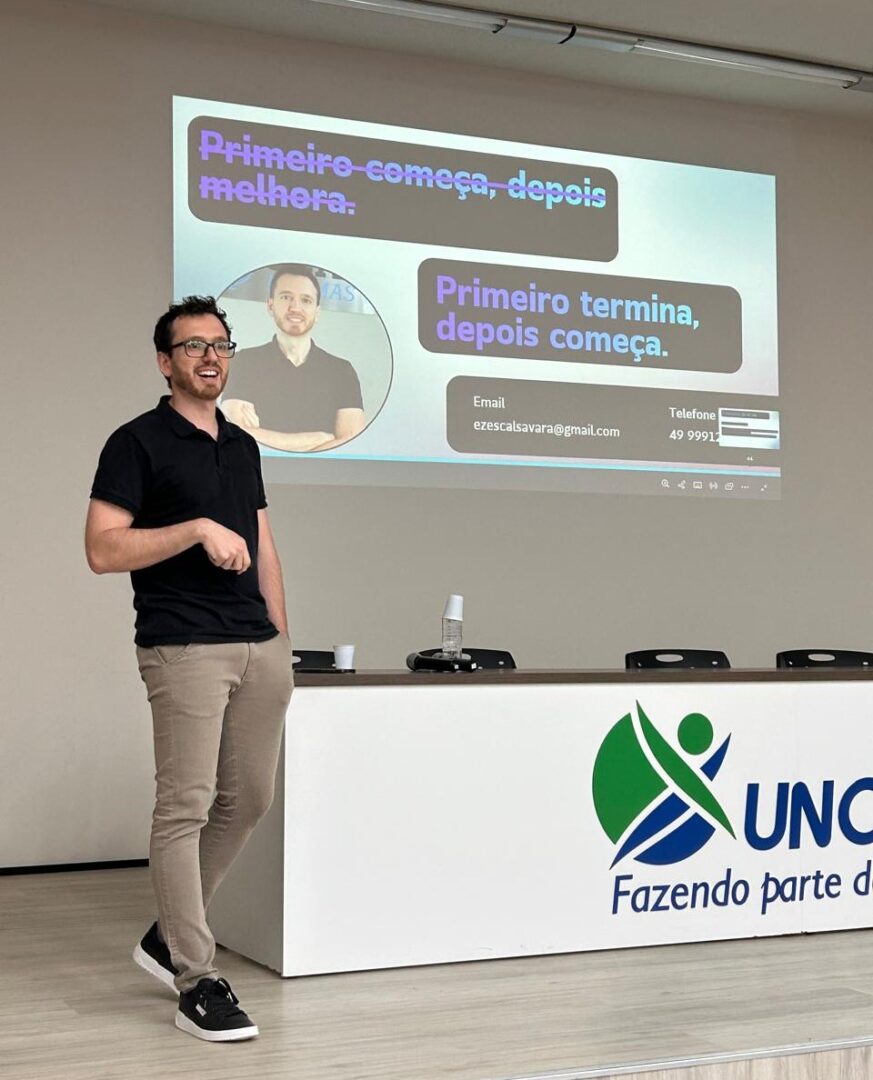 A palestra foi promovida pelo I.nova Unoesc, o ambiente acadêmico de inovação e empreendedorismo da Unoesc, e ministrada pelo professor Ezequiel Henrique Scalsavara, especialista em Inteligência Artificial e Negócios. Na ocasião, ele apresentou aos estudantes diferentes aplicações práticas da IA, destacando sua utilização na pesquisa jurídica, na organização de dados e no apoio à tomada de decisões.