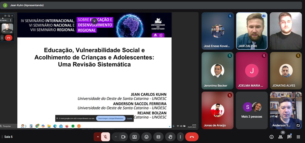 No dia 25 de julho, o estudante Jean Carlos Kuhn, da décima fase do curso de Arquitetura e Urbanismo da Unoesc Xanxerê, participou do “5º Seminário Internacional, 6º Nacional e 8º Regional sobre Educação e Desenvolvimento Regional”, promovido pelo Programa de Pós-graduação da Universidade do Contestado (UNC). Na ocasião, apresentou o artigo “Educação, Vulnerabilidade Social e Acolhimento Institucional de Crianças e Adolescentes: Uma Revisão Sistemática”, desenvolvido na disciplina de “Trabalho de Curso I”, sob orientação da professora Rejane Bolzan e coorientação do professor Anderson Saccol Ferreira.