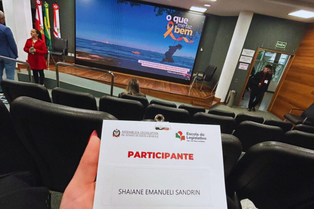 A estudante Shaiane Emanuele Sandrin, da oitava fase do curso de Direito da Unoesc São Miguel do Oeste, participou da 10ª edição do Estágio-Visita, na Assembleia Legislativa do Estado de Santa Catarina, em Florianópolis.