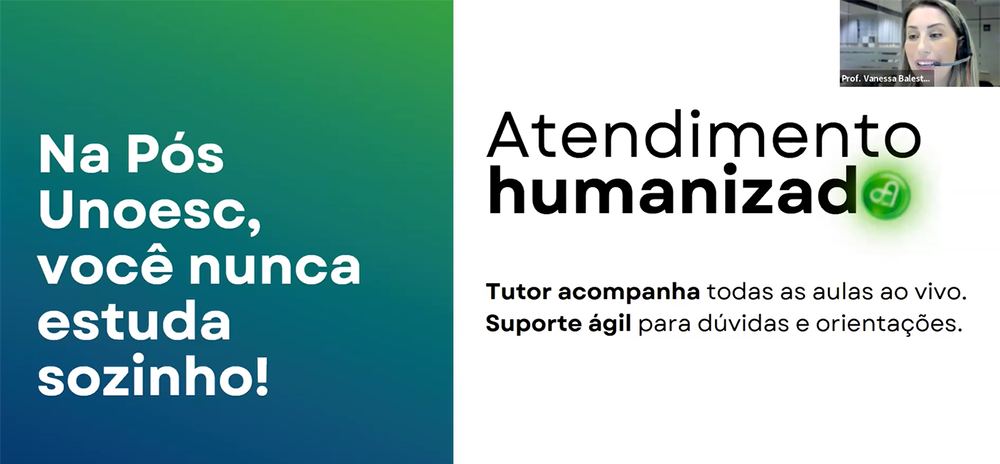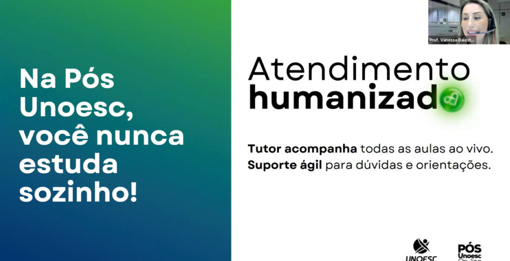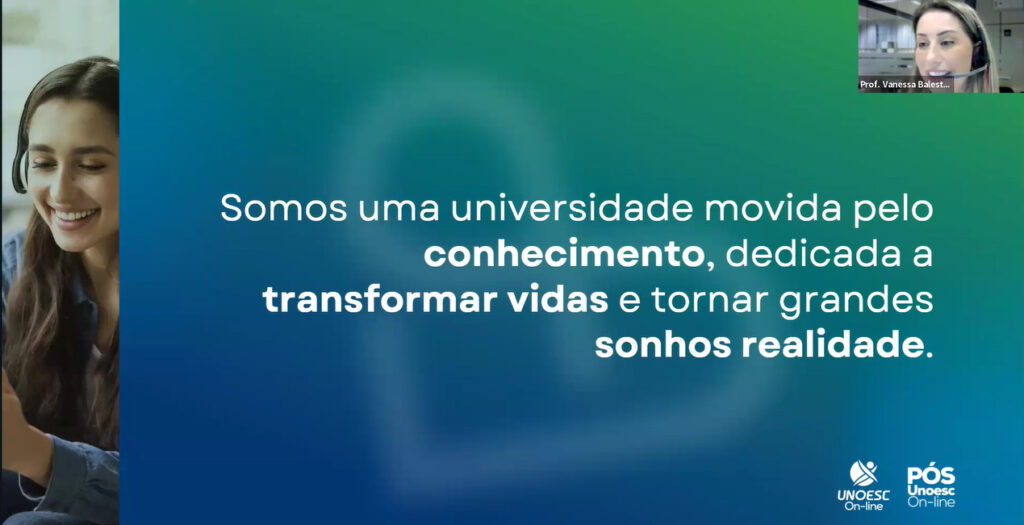 Durante o encontro, o pró-reitor de Pesquisa, Pós-graduação, Extensão e Inovação da Unoesc, professor Kurt Schneider, deu as boas-vindas aos participantes e destacou a importância da interação e a troca de experiências no ambiente virtual, ressaltando a diversidade geográfica dos estudantes. A coordenadora da Unoesc On-line, professora Roseli Aparecida Rocha Moterle, falou sobre a qualidade do ensino oferecido pela Unoesc, considerada a melhor Universidade Comunitária de Santa Catarina, enfatizando a flexibilidade do ensino a distância e ressaltando o suporte oferecido pela Instituição. Já a coordenadora dos cursos de Pós-graduação On-line, professora Vanessa Balestrin, apresentou o funcionamento dos cursos, destacando as aulas semanais ao vivo via Zoom, a flexibilidade de assistir às aulas gravadas posteriormente e o suporte oferecido por tutores e professores. Ela também mencionou a importância da atualização constante do conteúdo e a qualidade dos professores atuantes no mercado.
