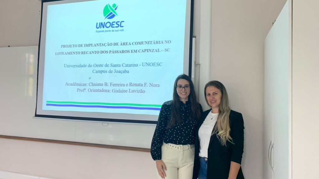 As estudantes Renata Nora e Chaiana Bertusso Ferreira, da décima fase do curso de Engenharia Civil da Unoesc Joaçaba, apresentaram, no dia 6 de dezembro, à Associação de Moradores Unidos Somos Mais, em Capinzal, o projeto arquitetônico e seus complementares para a implantação de uma área comunitária no Loteamento Recanto dos Pássaros. A iniciativa é resultado do Trabalho de Conclusão de Curso (TCC), orientado pela professora Doutora Gislaine Luvizão.