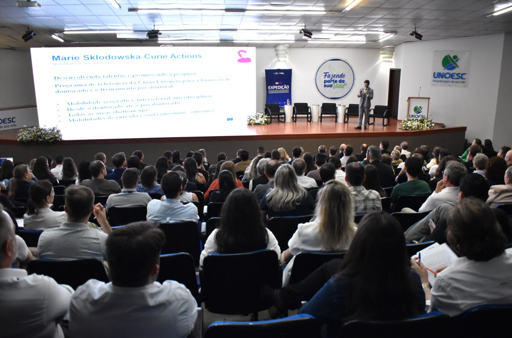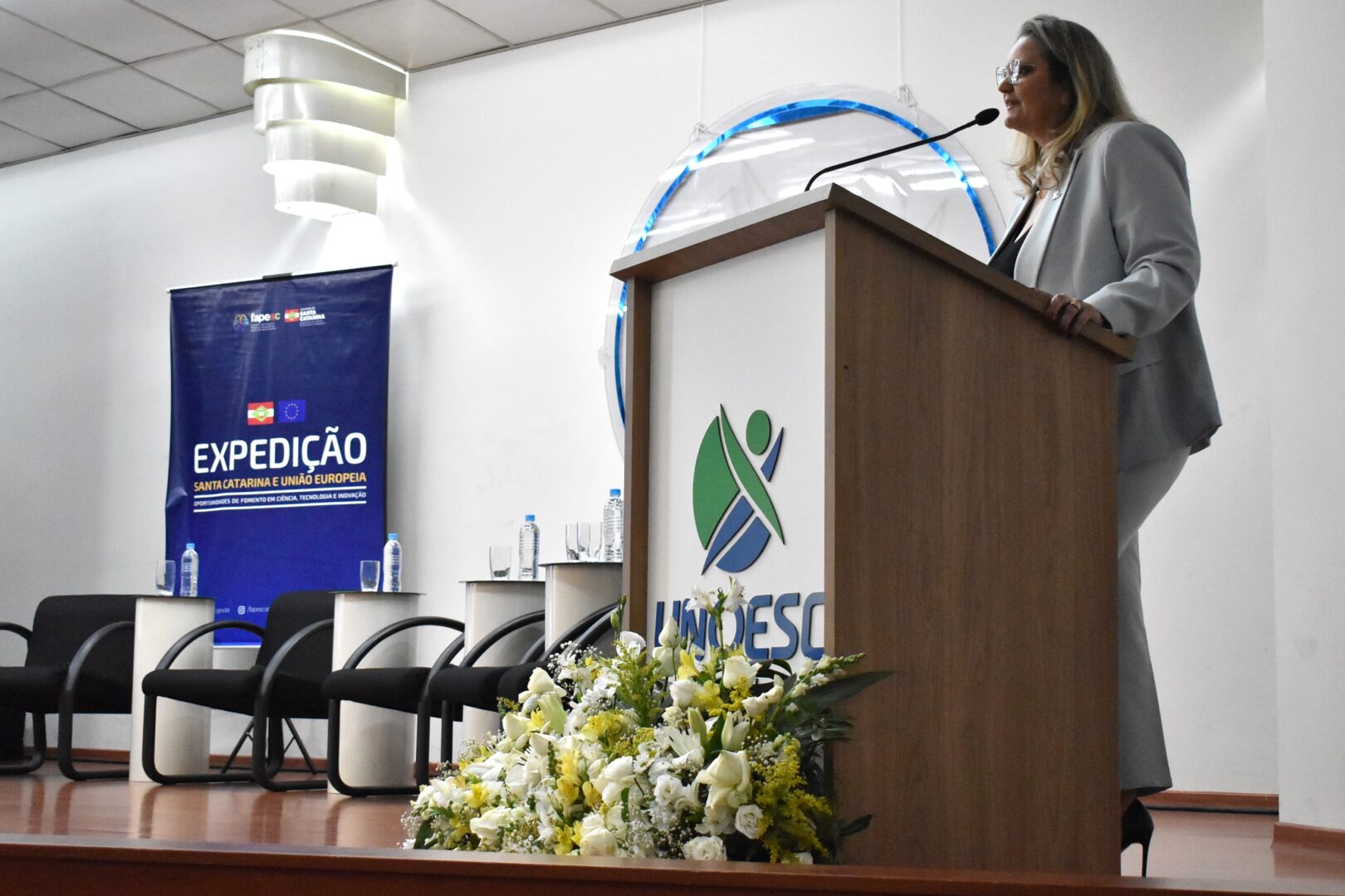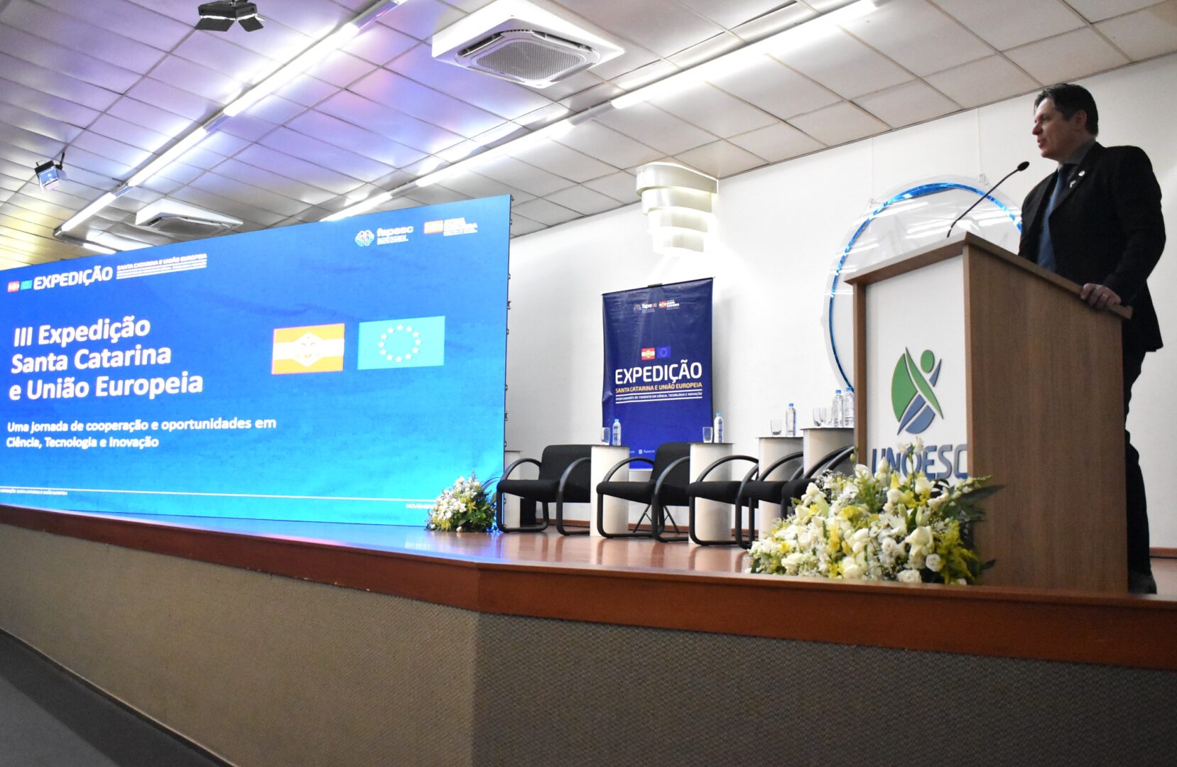 Realizada em parceria com a Unoesc e a União Europeia, a Expedição em Joaçaba teve como principal objetivo apresentar as oportunidades oferecidas pelo programa “Horizonte Europa” e por outros mecanismos de cooperação internacional em Ciência, Tecnologia e Inovação (CTI). A iniciativa também buscou fortalecer a aproximação e as parcerias entre Santa Catarina e a União Europeia, mapear áreas de interesse mútuo para futuras chamadas e projetos conjuntos, bem como celebrar o lançamento de editais da Fapesc voltados à pesquisa e ao empreendedorismo.