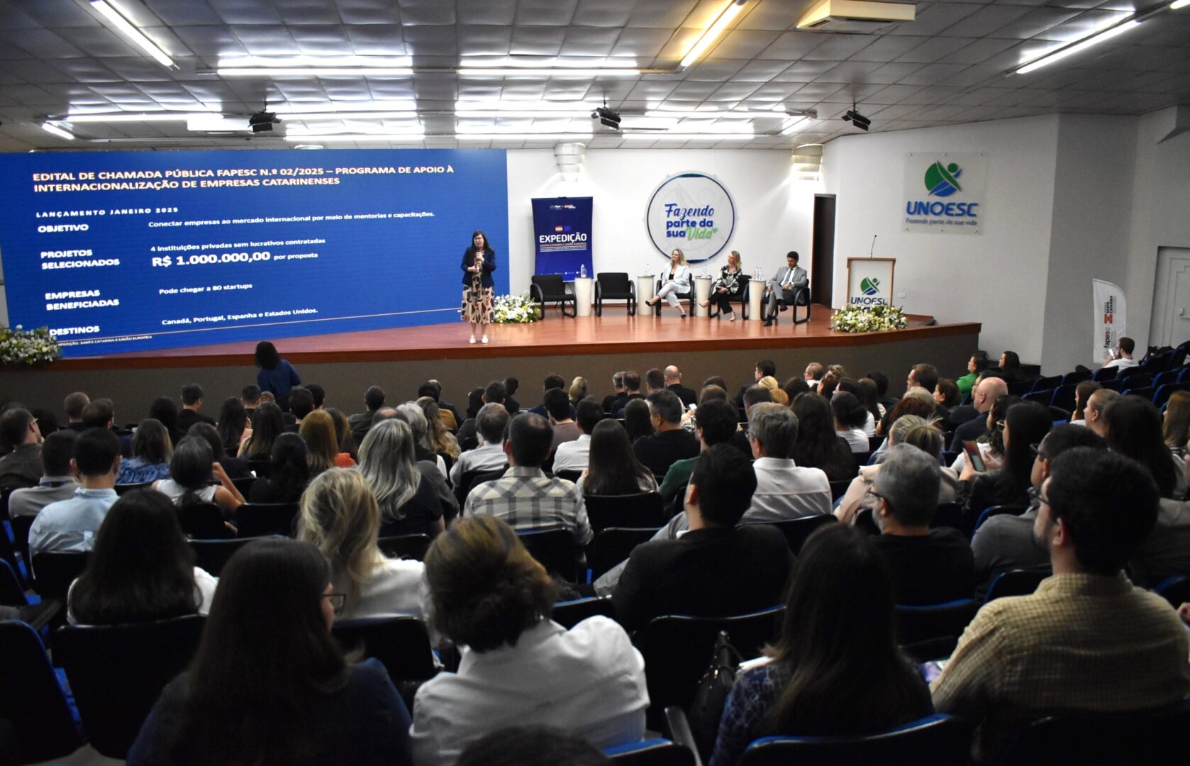 O Governo de Santa Catarina, por meio da Fundação de Amparo à Pesquisa e Inovação do Estado (Fapesc), promoveu, na terça-feira (25), no Auditório Afonso Dresch, em Joaçaba, a “3ª Expedição Santa Catarina e União Europeia”. Além de dirigentes da Unoesc, o evento reuniu empreendedores, gestores públicos, pesquisadores, professores, estudantes e representantes do ecossistema de inovação da região Oeste catarinense.