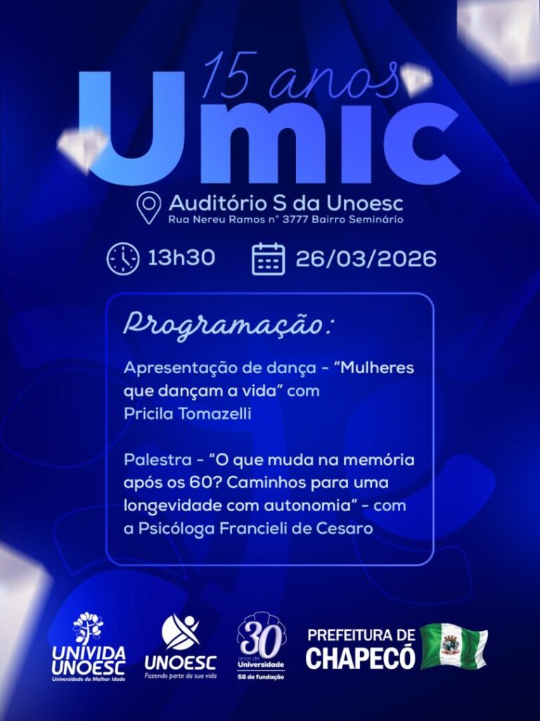 A celebração dos 15 anos da Umic reforça o compromisso da Unoesc com a educação ao longo da vida, o fortalecimento de políticas públicas voltadas à pessoa idosa e a promoção de uma sociedade mais inclusiva. O evento é gratuito e aberto à comunidade.