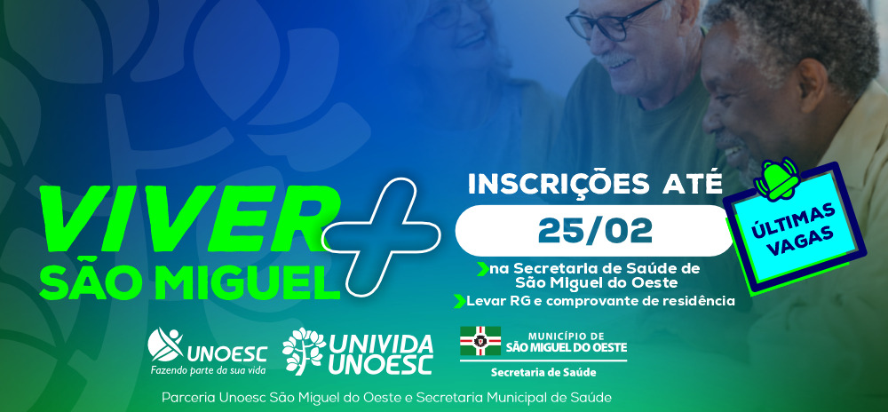 Encerram nesta quarta-feira (25) as inscrições para a nova edição da Universidade da Melhor Idade (Univida), programa desenvolvido pela Unoesc São Miguel do Oeste em parceria com a Secretaria Municipal de Saúde. O projeto integra o Programa Viver Mais São Miguel e é voltado a pessoas com 50 anos ou mais, promovendo socialização, educação continuada, cuidado com a saúde e qualidade de vida.