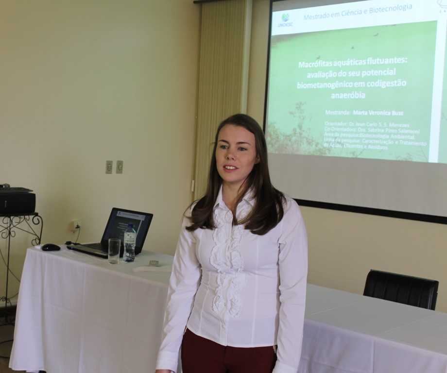 A aluna Marta Verônica Buss, orientada pelo Dr. Jean Carlo S. dos Santos Menezes e Dra. Sabrina Pinto Salamoni, desenvolveu pesquisa no Núcleo Biotecnológico da Unoesc, campus Videira, sobre Macrófitas Aquáticas Flutuantes: avaliação do seu potencial biometanogênico em codigestão anaeróbia, com o apoio parcial da Fundação Itaipu.