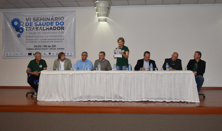 A mesa de autoridades foi formada pela coordenadora do evento e da Comissão Intersetorial de Saúde do Trabalhador e da Trabalhadora (CISTT), Marisa Magali Maieski Wames, pelo presidente do Conselho Municipal de Saúde de Joaçaba, Jair Antonio Schüler, pelo vice-prefeito de Joaçaba, Jucelino Ferraz, pelo vereador de Joaçaba, Sergio Favretto, pelo secretário municipal da Saúde, Valmor Reisdorfer, pelo presidente da Federação dos Trabalhadores Metalúrgicos de Santa Catarina, Evaldo Gramkow, pelo presidente do Sindicato dos Trabalhadores nas Indústrias Metalúrgicas, Mecânicas e do Material Elétrico de Joaçaba e Herval d’Oeste, Odenir José Contini, pelo vice-presidente para assuntos regionais do centro-oeste, da Federação das Indústrias do Estado de Santa Catarina (FIESC), Márcio Luís Dalla Lana.