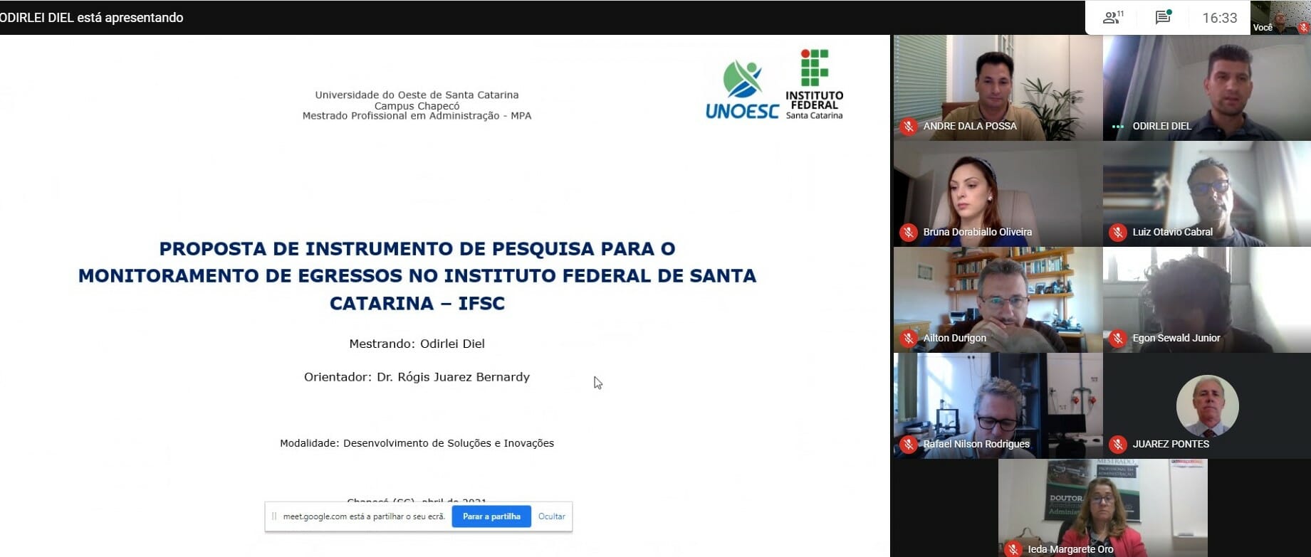 A apresentação e disponibilização da pesquisa contou com a presença da coordenadora do Mestrado Profissional em Administração, professora Doutora Ieda Margarete Oro e do Magnífico Reitor do IFSC, Professor Doutor André Dala Possa e de todo o seu quadro diretivo. A pesquisa também é resultado de um convênio interinstitucional entre Unoesc e IFSC para a formação de um grupo de técnicos administrativos em nível de stricto sensu, formado em 2019.