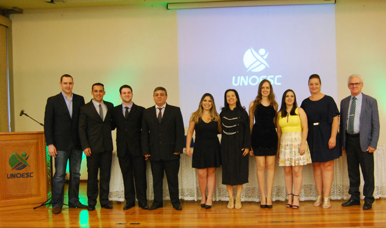 A noite de sexta-feira (17) marcou o encerramento de um ciclo para oito médicos que concluíram as suas residências no Hospital Universitário Santa Terezinha (HUST). Formaram a mesa para esta cerimônia, a diretora de Pesquisa, Pós-graduação e Extensão da Unoesc Joaçaba, professora Jéssica Romeiro Mota, representando o reitor, professor Aristides Cimadon; a gerente pedagógica do HUST, professora Patrícia Zílio Tomasi, representando o diretor geral do hospital, professor Alciomar Antonio Marin; e o coordenador do curso de Medicina, professor Walter Rothbarth e o presidente da Comissão de Residência Médica, professor Roberto Zílio.