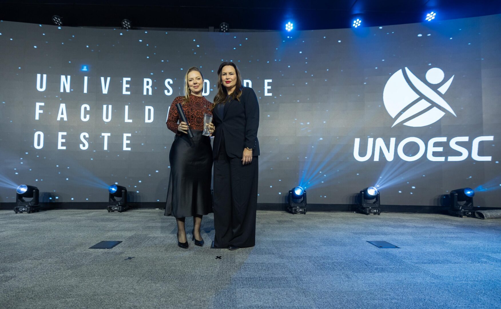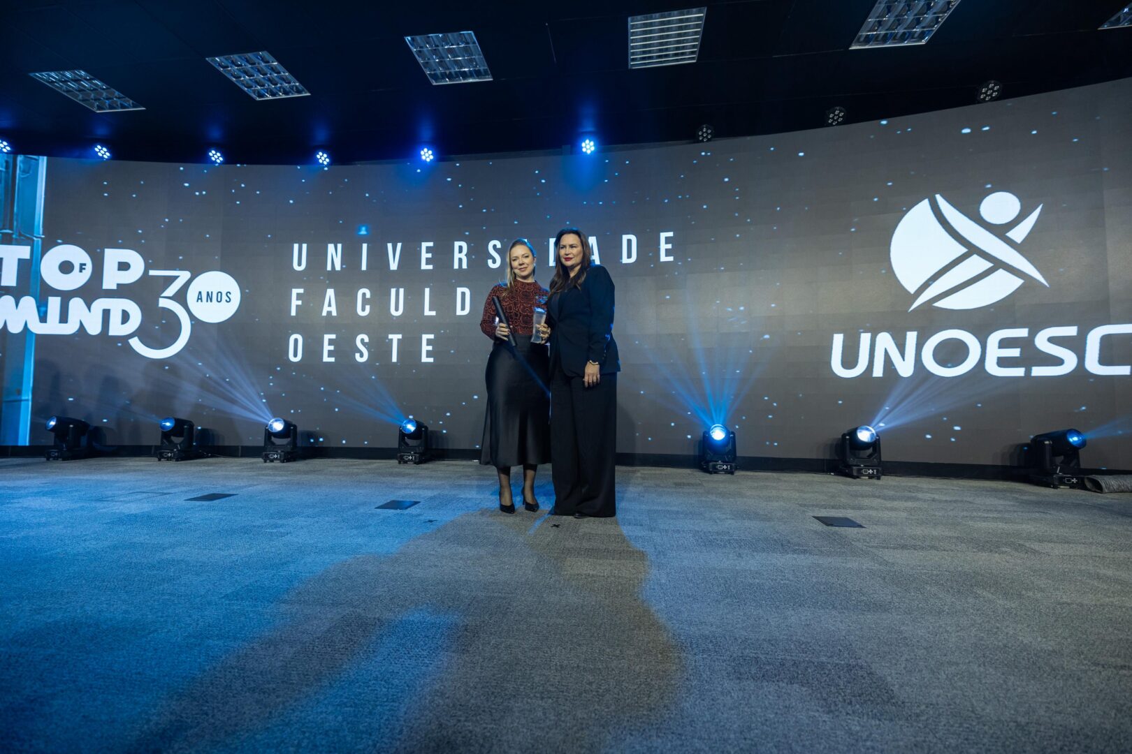 Em cerimônia na noite de quinta-feira (14), na sede da Federação das Indústrias de Santa Catarina (FIESC), em Florianópolis, a Unoesc recebeu o “Prêmio Top of Mind 2025”, que destaca as marcas mais lembradas pelos catarinenses. A 30ª edição do evento, realizada pela NSC Comunicação, contemplou empresas em 37 categorias, divididas entre “Top Executivo”, “Top População Estadual” e “Top População Regional”.