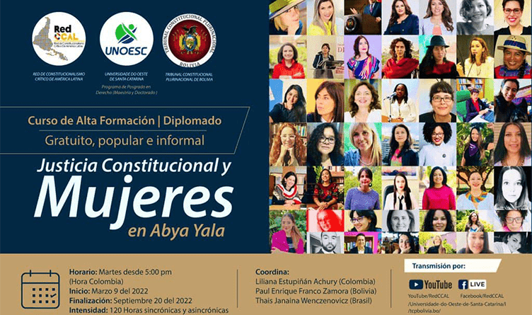 O Programa de Pós-graduação em Direito da Unoesc Chapecó em parceria com o Tribunal Constitucional Plurinacional da Bolívia e a Rede de Constitucionalismo da América Latina-RedCCAL promove o Curso de Alta Formación/Diplomado Justicia Constitucional y Mujeres en Abya Yala’. Essa é uma iniciativa inédita, mulheres de diversos países da América Latina reuniram-se para oferecer o Curso de Formação Continuada com carga horária de 120 horas na modalidade on-line. O curso inicia em 09 de março de 2022 todas as terças-feiras a partir das 17h. (horário da Colômbia) e termina em 20 de setembro de 2022.