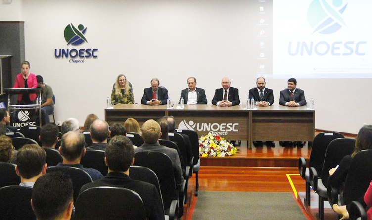 Na mesa diretora estavam o reitor da Unoesc, Aristides Cimadon, o presidente da Funoesc, Genésio Téo, o vice-reitor da Unoesc Chapecó, Ricardo Antônio de Marco, o pró-reitor de Pesquisa e Pós-graduação da Universidade Federal da Fronteira Sul e presidente do Fórum Nacional de Pró-reitores de Pesquisa e pós-graduação, Joviles Trevisol, o coordenador do Doutorado em Administração, Carlos Eduardo Carvalho, e a convidada para ministrar a aula inaugural, doutora Ilse Maria Beuren.
