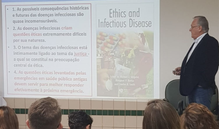 Ao final ele abordou sobre os cuidados a serem adotados nas epidemias e pandemias, como por exemplo, no respeito à autonomia, privacidade, respeito às normas nacionais e internacionais sobre ética em pesquisa nos ensaios de novas vacinas e medicamento, entre muitas outras situações éticas complexas.