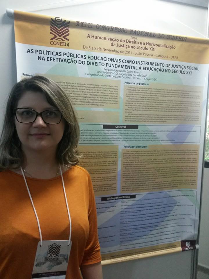A professora do curso de Direito da Unoesc Chapecó, Darléa Carine Palma, participou no mês de novembro, do XXIII Congresso Nacional do Conpedi (Conselho Nacional de Pesquisa e Pós-Graduação em Direito), em João Pessoa/PB. Representando a Unoesc no evento, a professora apresentou o projeto de pesquisa “As políticas públicas educacionais como instrumento de justiça social na efetivação do direito fundamental à educação no Século XXI”, o qual foi agraciado com Menção Honrosa pelo Conpedi.
