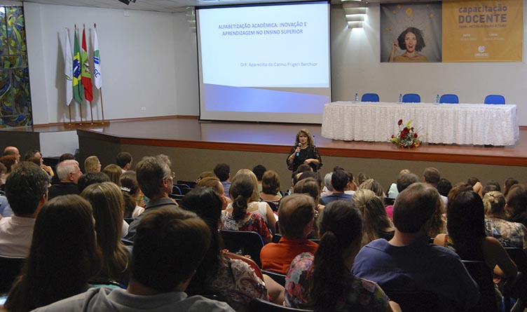 Em Joaçaba, a abertura da Semana de Capacitação Docente ocorreu na segunda-feira (15), com a palestra “Alfabetização acadêmica: inovação e aprendizagem no ensino superior”, ministrada pela professora doutora Aparecida do Carmo Frigeri Berchior.