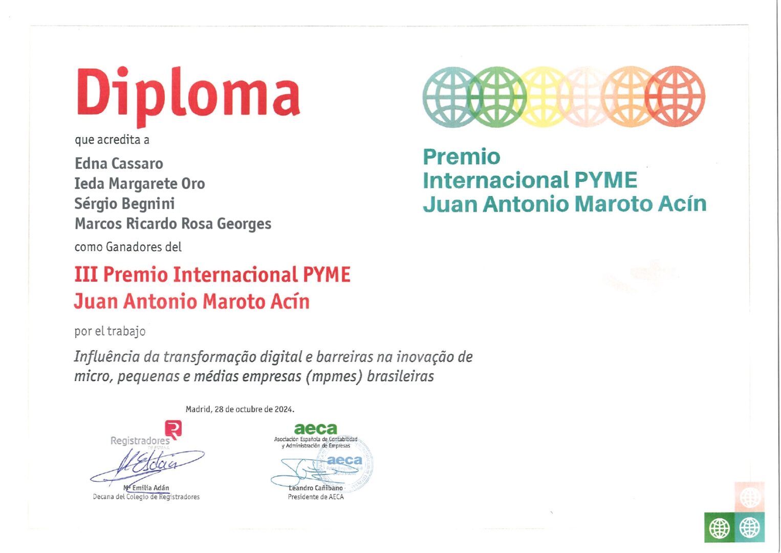 Os professores do Programa de Pós-graduação em Administração (PPGA) da Unoesc, Ieda Margarete Oro e Sérgio Begnini, juntamente com a doutoranda Edna Cassaro, foram premiados pelo Colégio de Registradores da Espanha e pela Associação Espanhola de Contabilidade e Administração de Empresas (AECA) na terceira edição do “Prêmio Internacional para Pequenas e Médias Empresas Juan Antonio Maroto Acín”. O reconhecimento ocorreu no dia 28 de outubro e inclui uma premiação de € 1.500 (mil e quinhentos euros) e diplomas de reconhecimento pelo impacto da pesquisa desenvolvida em parceria com o professor Marcos R. R Georges, da Pontifícia Universidade Católica (PUC-Campinas).