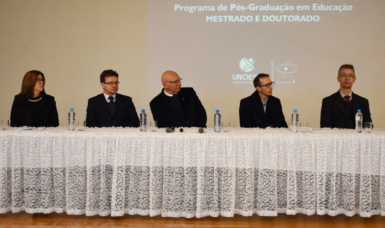 Na ocasião, a mesa de autoridades foi composta pelo reitor, Aristides Cimadon, pelo pró-reitor de Pesquisa, Pós-Graduação e Extensão, professor Fábio Lazzarotti, pelo coordenador do PPGE, Elton Luiz Nardi, pela vice-coordenadora do PPGE, Marilda Pasqual Schneider, e pelo diretor de Pesquisa, Pós-Graduação e Extensão, Júlio César Ribeiro Lyra.
