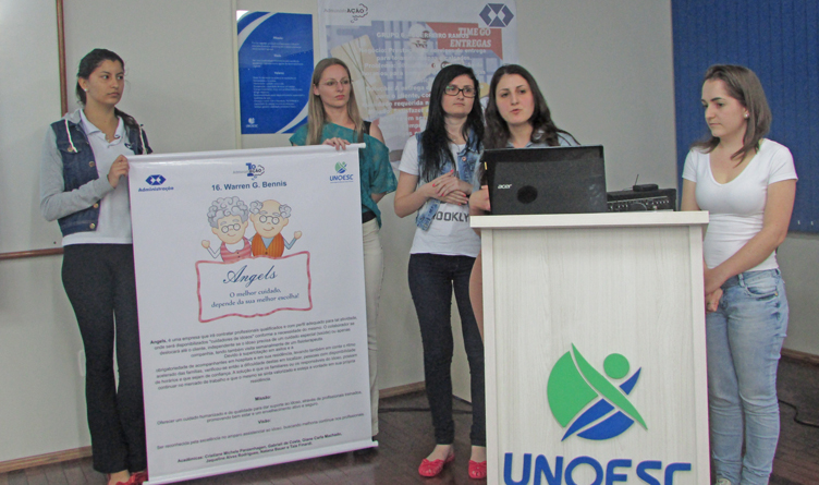A etapa final do 1º AdministrAÇÃO foi realizada, sexta-feira (14), na Unoesc Maravilha. O projeto “Angels: o melhor cuidado depende da sua melhor escolha” foi indicado, por uma banca integrada por empresários, como o vencedor da competição de negócios do curso de Administração. A proposta foi desenvolvida pelos acadêmicos Cristiane Panzenhagem, Gabrieli da Costa, Giani Machado, Jaqueline Rodrigues, Jocimar Grassi, Natana Bauer e Taís Finardi. A equipe recebeu um passaporte para visitar a empresa Nord Electric, de Chapecó, além de caneca e pasta.