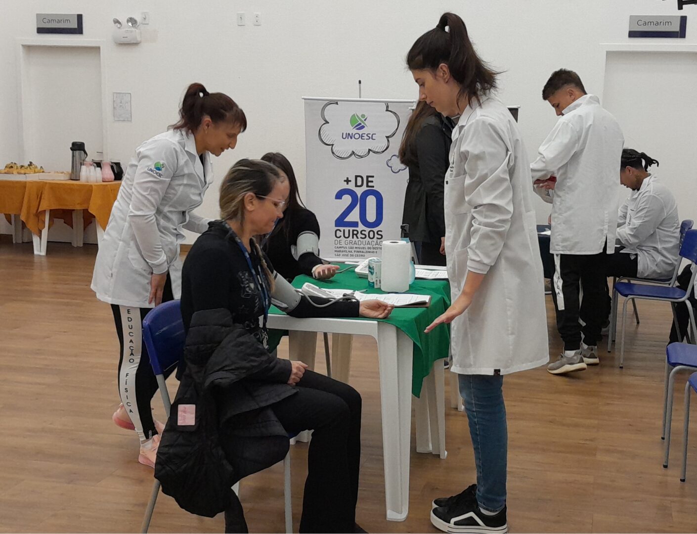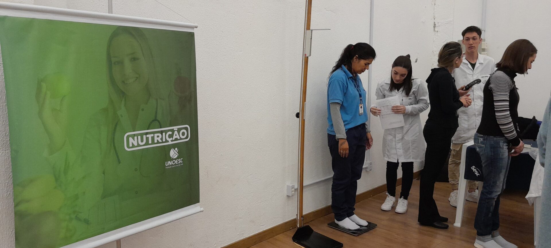 Pensando na qualidade de vida dos trabalhadores, o Sesc convidou os Cursos de Educação Física e Nutrição da Unoesc São Miguel do Oeste para participarem de ações de promoção da saúde, voltadas aos colaboradores da instituição, projeto intitulado QualiVida. Na terça-feira (16), foram realizados diversos atendimentos, como atividades de flexibilidade, força de preensão manual, aferição de pressão arterial, frequência cardíaca, saturação periférica de oxigênio, peso, estatura, bioimpedância manual (percentual de gordura e índice de massa corporal) e orientações nutricionais.
