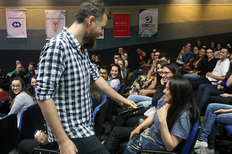 Marcos Piangers, repórter do programa Fátima Bernardes da TV Globo, colunista do Diário Catarinense, escritor e membro do programa Pretinho Básico, da Rede Atlântida de Rádios do grupo RBS ministrou palestra, na sexta-feira (21), para um grupo de estudantes, professores, empresários e profissionais da área da comunicação de Videira e região. Mais de 400 pessoas marcaram presença, lotando o auditório da Unoesc Videira, que promoveu o evento através dos cursos de Administração e Ciências Contábeis.