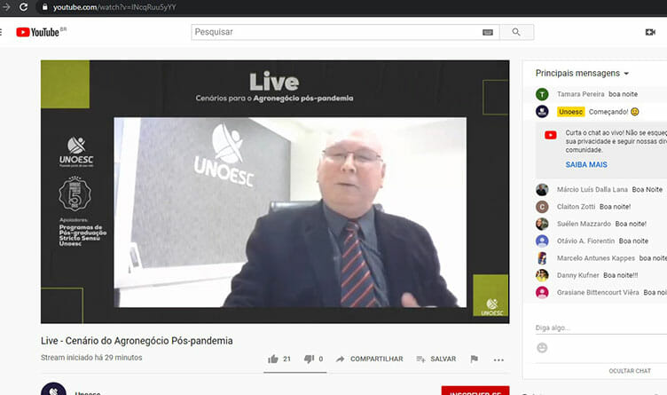 Na noite de terça-feira (21), a Unoesc promoveu um importante momento de discussão sobre o momento vivido pelo agronegócio e os cenários no pós-pandemia. A Live foi moderada pelo reitor da Unoesc, professor Aristides Cimadon e teve a participação dos seguintes convidados: Superintendente Técnico da Confederação Nacional de Agricultura (CNA), Bruno Lucchi; Secretário da Agricultura, Pesca e Desenvolvimento Rural do Estado de Santa Catarina, Ricardo Gouvêa; Senador Jorginho Mello; Presidente da Federação da Agricultura e Pecuária do Estado de Santa Catarina (Faesc), José Zeferino Pedrozo; do Secretário de Aquicultura e Pesca do Ministério da Agricultura, Pecuária e Abastecimento, Jorge Seif Junior e do Presidente da Federação Catarinense de Municípios (Fecam) e prefeito de Major Vieira, Orildo Severgnini.