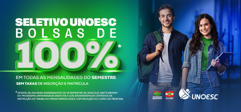Estão abertas as inscrições para o Seletivo Unoesc, com matrículas gratuitas e bolsas de 100% de desconto em todas as mensalidades do segundo semestre de 2024. Os interessados podem acessar o edital, obter mais informações e se inscrever pelo site da Universidade. As aulas iniciam no dia 29 de julho.