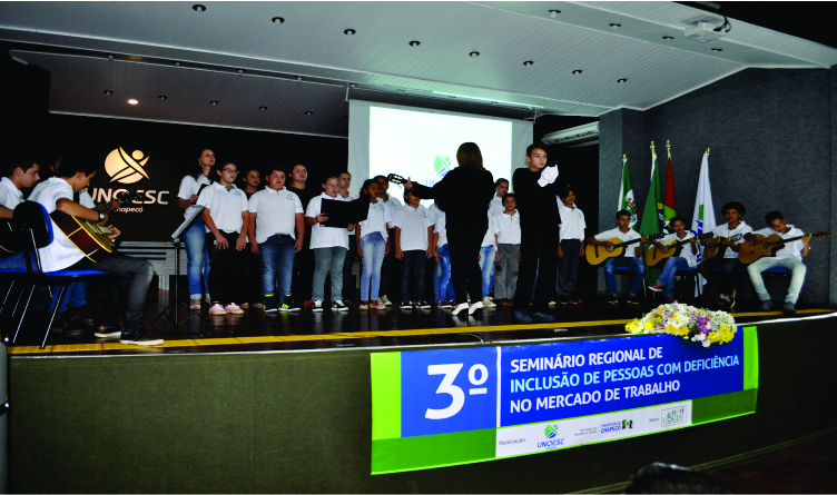 O 3º Seminário regional de inclusão de pessoas com deficiência no mercado de trabalho realizado na última semana, no auditório da Unoesc Chapecó reuniu representantes de empresas com necessidade de cumprimento de cotas de Pessoas com Deficiências (PCD) no mercado de trabalho de Chapecó e região, pessoas com deficiência, entidades de classe, professores, acadêmicos, pessoas da comunidade interessadas na temática. A abertura do evento contou com apresentação musical e interpretação em Libras do Centro de Apoio à Criança e ao Adolescente (CEACA) de Xaxim.