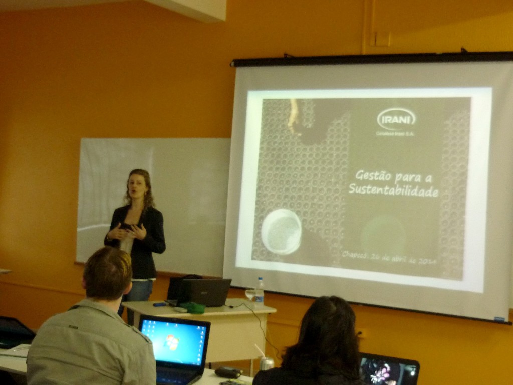 Os mestrandos também acompanharam palestra com a diretora de sustentabilidade da empresa Celulose Irani, Mariana Carlesso. O objetivo da palestra foi conhecer as ações de sustentabilidade que são desenvolvidas pela Celulose Irani e como é elaborado o relatório de sustentabilidade baseado nas diretrizes GRI (dificuldades encontradas para fazê-lo já que a lista de indicadores GRI é extensa e detalhada). Além disso, foi possível perceber quais são os maiores desafios que a empresa viveu quando iniciou a implantação da estratégia de sustentabilidade, como foi a aceitação dos colaboradores e quais as perspectivas relacionadas a sustentabilidade que a Irani possui. A empresa já desenvolve relatórios de sustentabilidade desde 2006 e possui compromisso com a sustentabilidade, pois entende que toda organização gera impactos e tem que se preocupar em mitigar esses impactos.