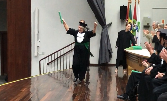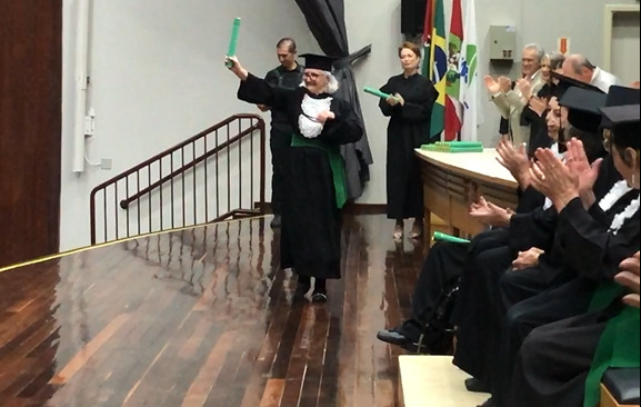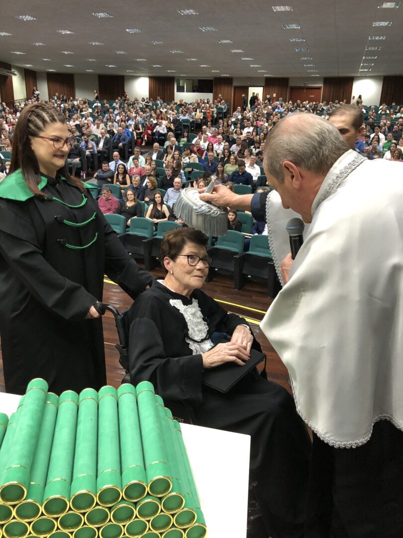 A cerimônia também foi marcada pela homenagem à senhora Catarina Zacaron, exaltada como exemplo de perseverança e comprometimento que, mesmo com suas limitações, não perdeu quase nenhuma aula e foi uma inspiração para todos os colegas.