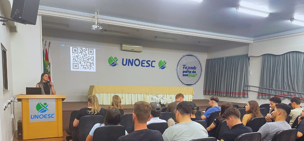 A coordenadora geral de Relações Internacionais da Unoesc, professora Fabiana Meneghetti Dallacosta, conduziu palestra sobre os editais abertos para mobilidade acadêmica. A apresentação incluiu modalidades presencial e virtual, com vagas em instituições parceiras de diferentes países.