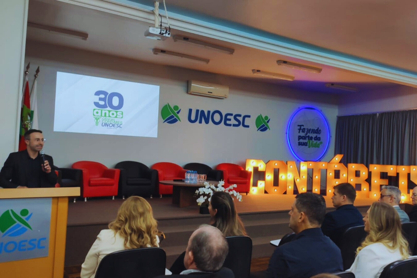 O Curso de Ciências Contábeis da Unoesc São Miguel do Oeste completou, em 2025, três décadas de história, formando mais de 1.200 profissionais, que hoje atuam em escritórios, empresas, órgãos públicos e entidades em Santa Catarina e no Brasil. A data foi celebrada no dia 24 de setembro, em solenidade realizada no Auditório F3, que reuniu autoridades, professores, egressos, estudantes e comunidade acadêmica.