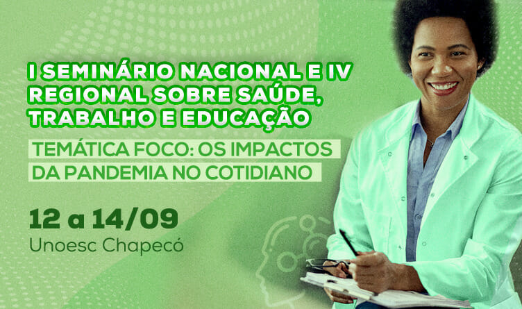 O curso de Psicologia da Unoesc Chapecó promove, de 12 a 14 de setembro, o 1º Seminário Nacional e o 4º Seminário Regional de Saúde, Trabalho e Educação. Com o tema “Os impactos da pandemia no cotidiano”, a programação conta com palestras, oficinas, socializações de trabalhos científicos e exposições de materiais e livros.