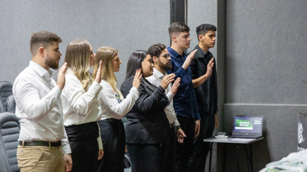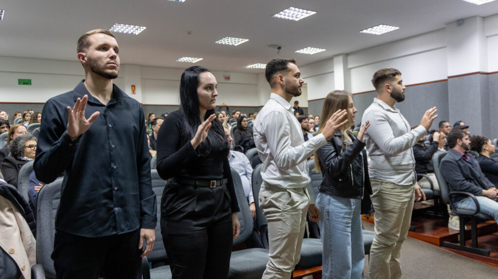Um dos momentos mais emocionantes foi o juramento conduzido pela representante de turma, Bruna Caroline Bordignon, quando os estudantes reafirmaram o compromisso com a profissão e com o cuidado ético e responsável. Logo após, receberam seus jalecos das mãos de seus familiares e membros da mesa de honra.