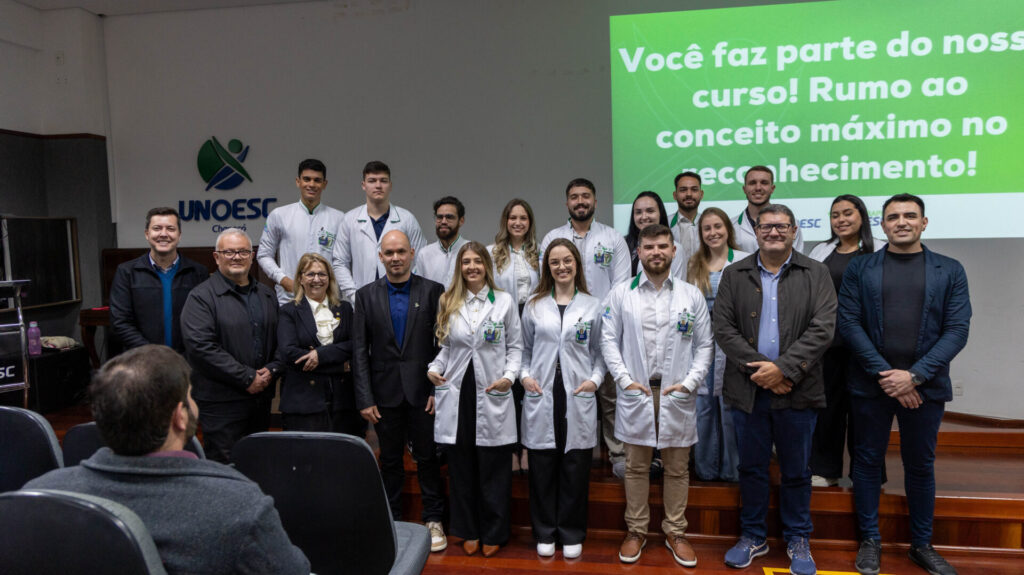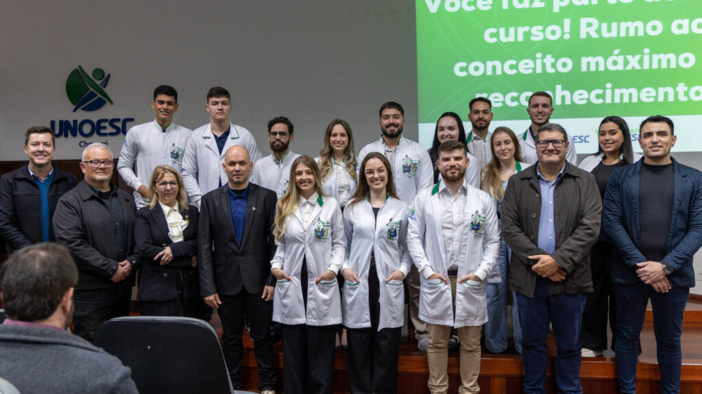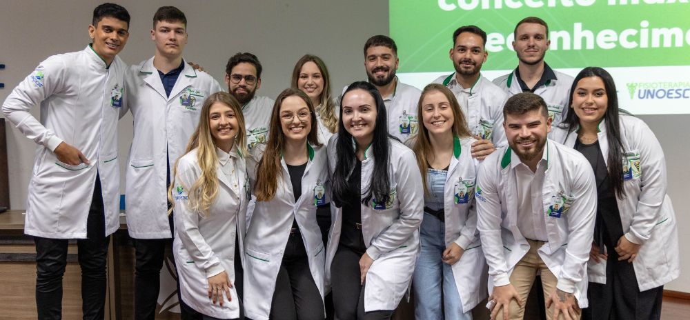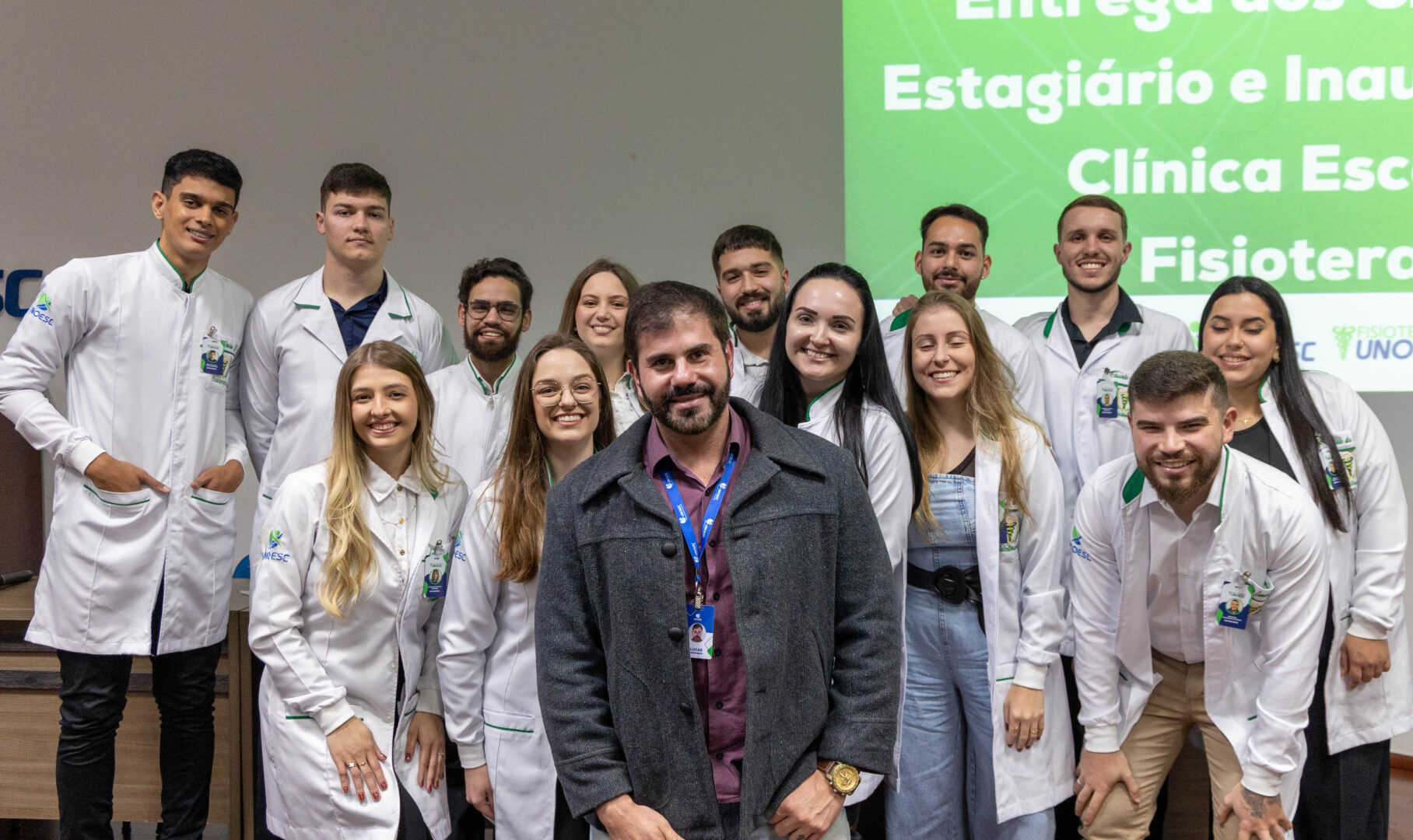 O curso de Fisioterapia da Unoesc Chapecó viveu um momento marcante, um marco triplo na trajetória, com a realização da “Cerimônia do Jaleco”, a entrega dos crachás de estagiário e a inauguração oficial da nova Clínica-escola de Fisioterapia, em evento realizado na noite de terça-feira (12). Ao todo, 13 estudantes da oitava fase do curso de Fisioterapia receberam o jaleco e o crachá, acompanhados de familiares e autoridades da Universidade.