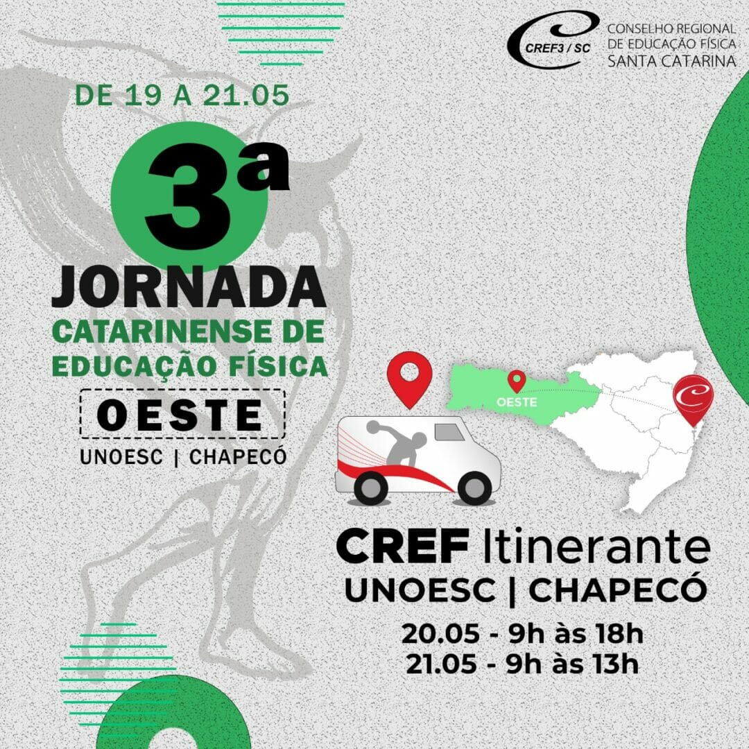 Já estão abertas as inscrições para a 3ª Jornada Catarinense de Educação Física da Região Oeste, que será realizada nos dias 19, 20 e 21 de maio, na Unoesc, em Chapecó. Serão nove cursos nas áreas de Educação Física Escolar, HIIT, Treinamento Personalizado, gestão, reabilitação funcional, entre outros, ministrados por especialistas na área. As inscrições são gratuitas no site e APP para profissionais de Educação Física registrados no Conselho e acadêmicos inscritos no CREF Jovem.
